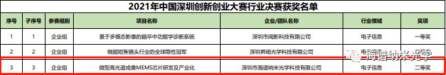 11月2日,2021年深创赛决赛获奖名单正式公布。自正式启动以来,吸引了来自35个国家和港澳台地区一共7337个项目报名参赛。经过激烈角逐,深圳市海谱纳米光学有限公司凭借”微型高光谱成像MEMS研发及产业化“荣获电子信息行业决赛二等奖的好成绩!